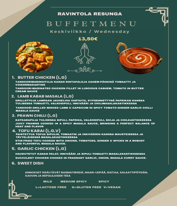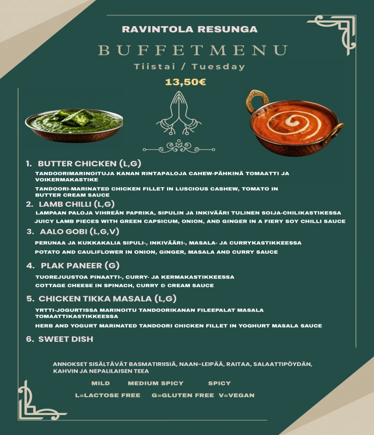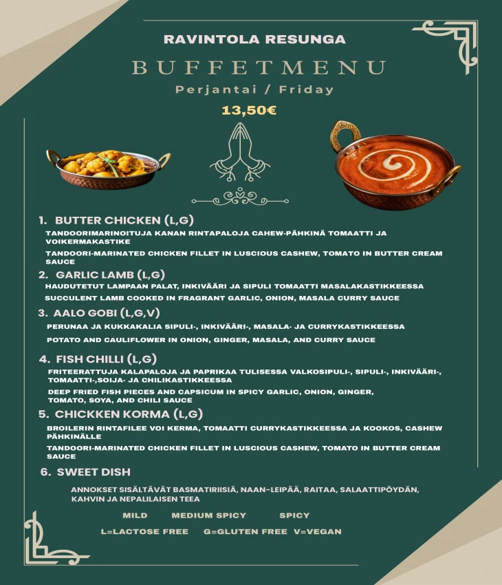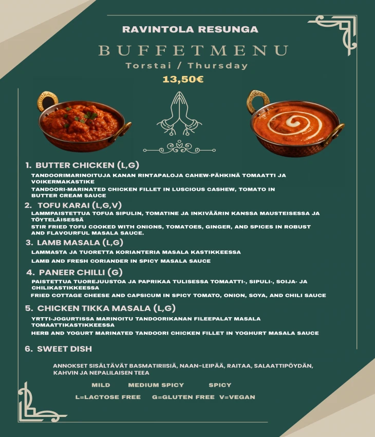 L = lactose-free (Note: the portion of the raita and mint sauce and the spread butter on naan bread may contain lactose. Be sure to ask for lactose-free substitutes instead.)